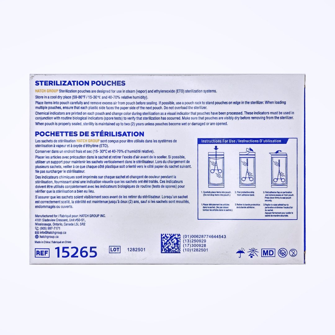 Designed for versatility, our Hatch self-sealing sterilization pouches support both steam and EO gas sterilization. Each pouch features a puncture-resistant, transparent film laminated to high-durability medical-grade paper for maximum protection.